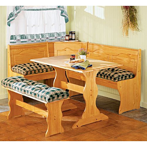 The new set would mean I would have to make cushions - ones with removable covers for washing (the ones shown are sold seperate). The wood marrs, scratches, finishes wear. While I like the trestle table ... the bench looks a bit unsteady ... with the bench more than one person would have to be comfy with the distance from the table.